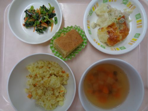 12月誕生日会メニュー(カレーピラフ・ポテトグラタン・じゃこサラダ・野菜スープ・パウンドケーキ)